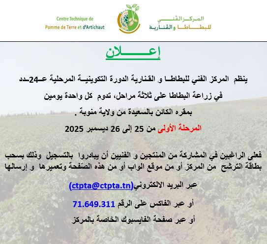 إعلان الدّورة التكوينية المرحليّة عدد 24 في زراعة البطاطا من 14 نوفمبر 2025 إلى 19 ديسمبر 2025 بطاقة الترشّحكل المستجدات